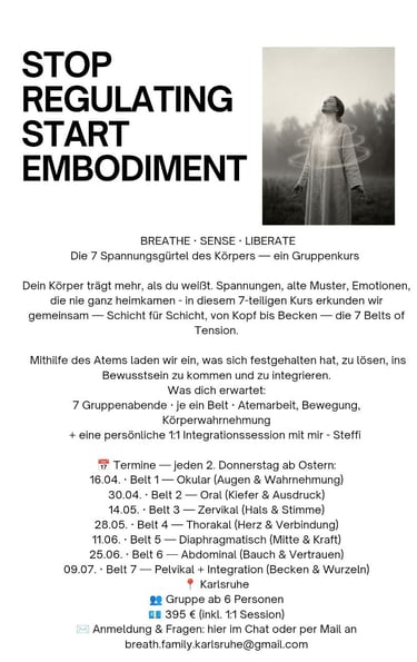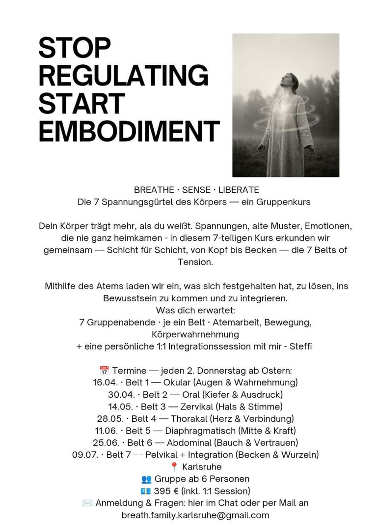 Atemarbeit kann helfen. Durch bewusstes, tiefes Atmen kommen wir in Kontakt mit dem, was der Körper gespeichert hat — ganz sanft, in deinem eigenen Tempo, getragen von der Gruppe.
